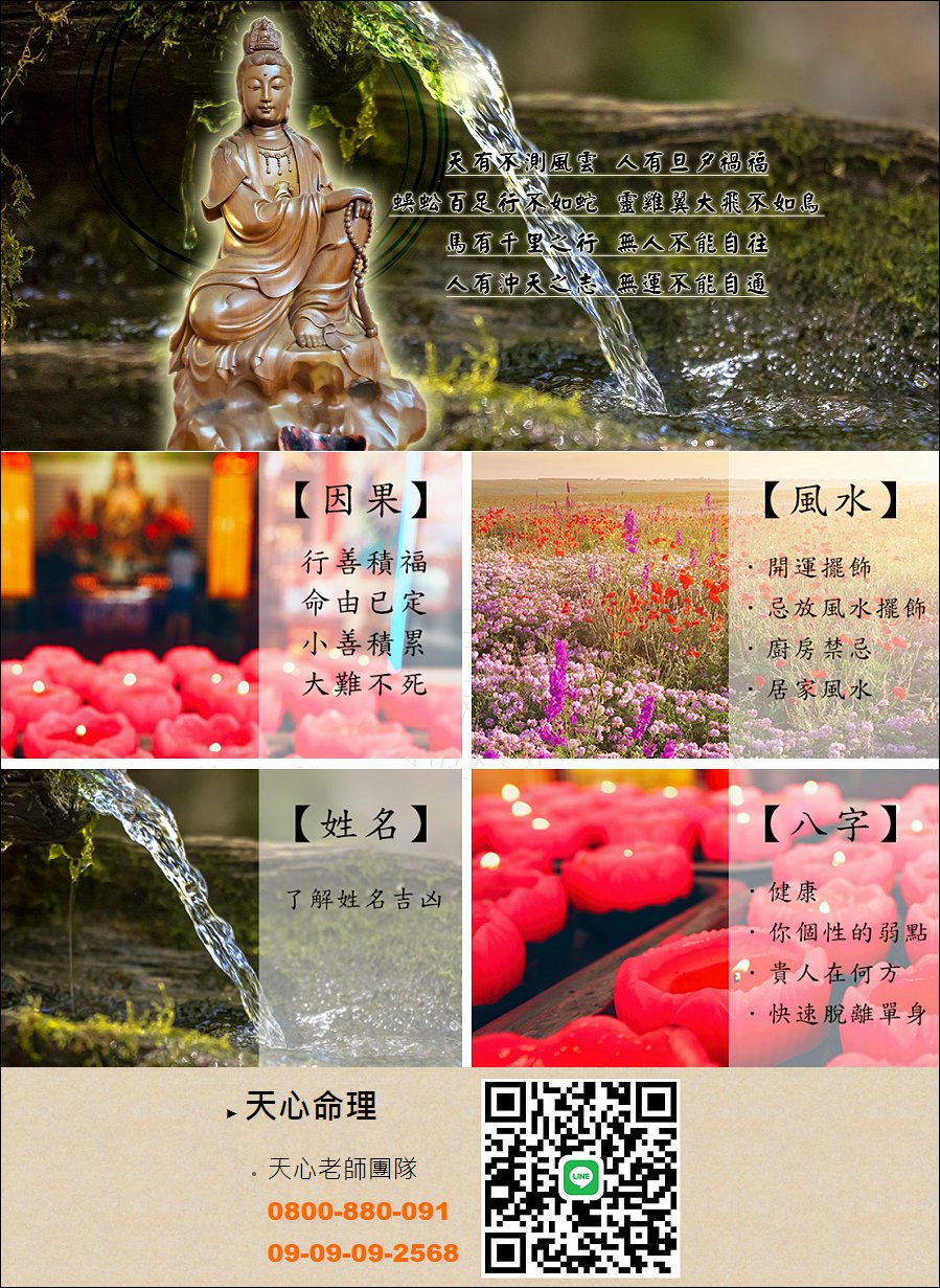 八字命盤吉凶禍福,由天心老師團隊親算指點迷津。